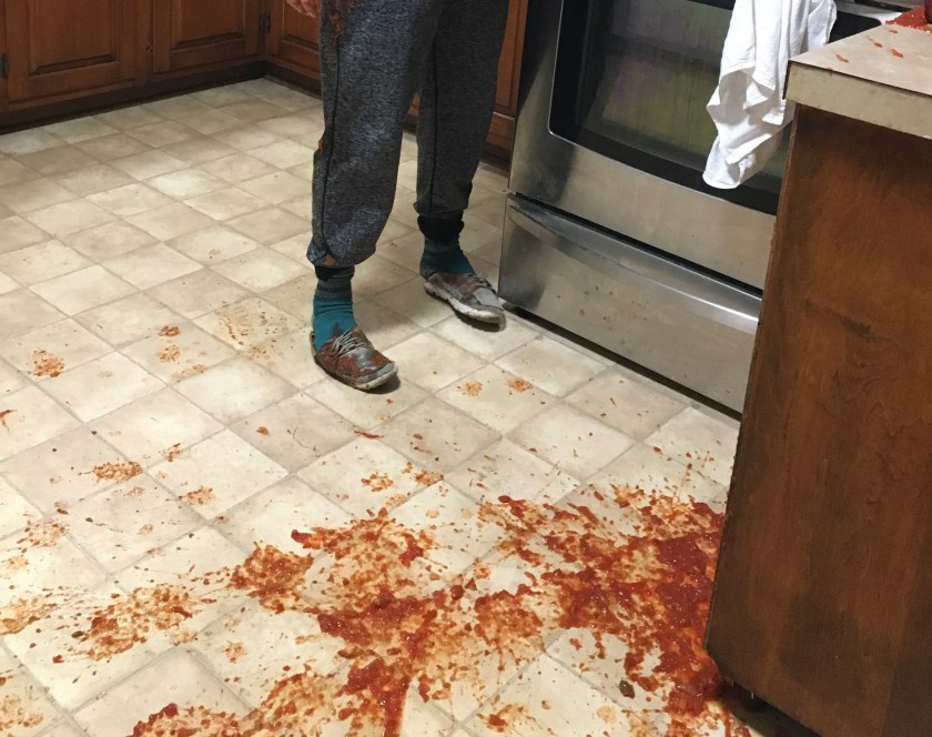The next day I set out to can the salsa and pasta sauce. I had the pressure canner filled with water, the pasta sauce in the big crock, and my salsa in a big pot. I was trying to do something foolish like half balance the pot off the stove to maneuver the crock in front of the canner and ended up with that picture above. It looks like someone got stabbed! There was salsa everywhere – on the floor, on the stove, under the stove, on the wall, in my shoes, in my hair! It was the worst salsa catastrophe I’ve ever witnessed. Luckily E helped me clean up, because after this second tomato disaster I was feeling incredibly useless and extremely frustrated by my apparent incompetence. And for the second time in a week I cried about tomatoes.