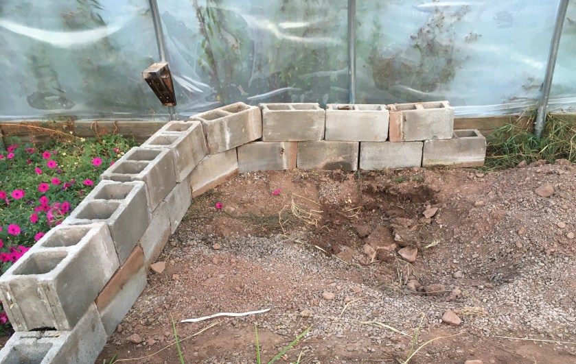 I know, I know, that is a thing of beauty! But seriously, that is the beginning of my pond in the greenhouse. Water has one of the highest capacities to hold heat of pretty any much material on Earth so it is a great way to keep a greenhouse warm at night when the sun isn’t shining and you haven’t figured out how the furnaces work and don’t really want to. So I made a pond – I dug a bit, I used approximately fifteen tons of cinder blocks (or at least that is how my back feels), I got a pond liner, and I filled it with some water.