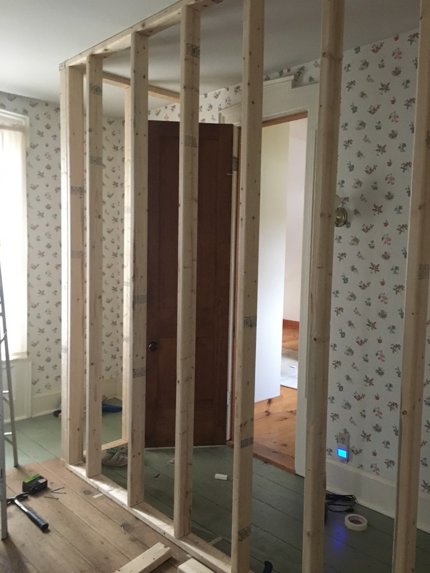 Look how nice those walls are!! E is excellent at building walls – she’s the carpenter around here. Our friends came up for the weekend and we put them to work. They helped us frame out what will be a new hallway so that our one bedroom will be a true bedroom that you don’t need to walk through to get to the other two.