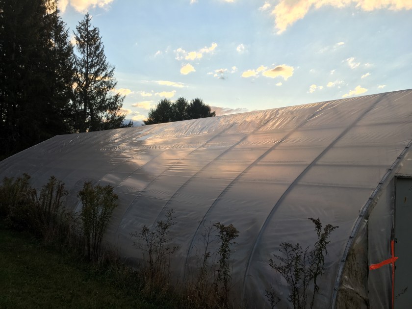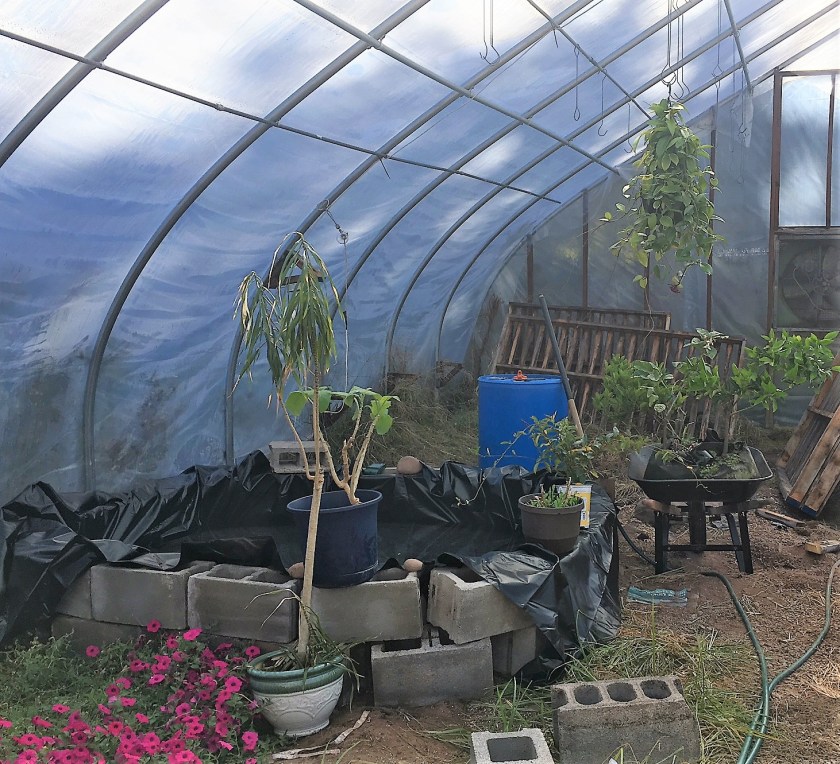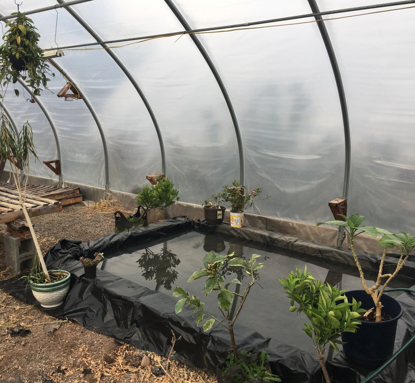 So during the day at some point it got up to almost 105 degrees, leading to the pond relocating onto the greenhouse film making it steamy and rainy inside. So, I did some research about this humidity issue, and I’m almost convinced it is an issue, but also not convinced that it needs an immediate or high-tech resolution. Apparently most plants don’t like a lot of humidity – it messes with their respiration and can lead to the spread of diseases, especially fungus and mildew issues. I also am pretty sure it’s not great for the materials in the greenhouse, mainly the electrical work in there, but that is less of a concern.