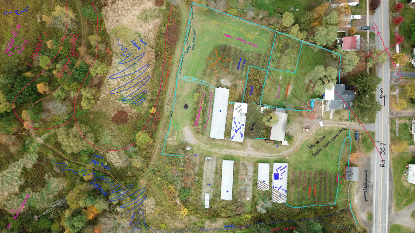 It’s called, Permaculture Design: Fundamentals of Ecological Design and I’m really enjoying it! I’ve started what is called a base map of the farm which you can see above. I’ve labeled all the different areas and identified structures and characteristics.